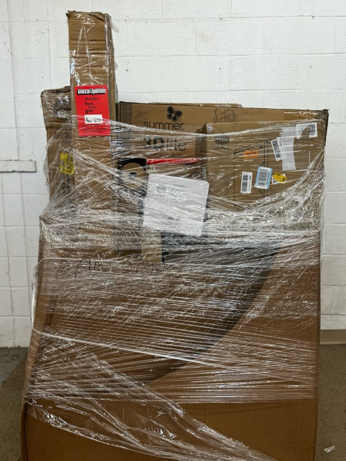 Pallet of liquidated miscellaneous amazon returned merchandise ranging from assorted kitchenware, baby items, electronics, small gadgets, tools, Home goods, & more. Nothing is guaranteed as the pallet is sold AS IS, there are no returns, exchanges, refunds or warranty. The pallet must be picked up from American liquidations within 2 days of purchase in Prospect, CT 06712.